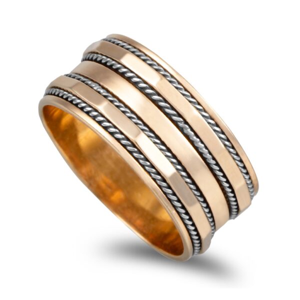 Aliança que pode ser usada para bodas de ouro, onde o centro apresenta fios torcidos trabalhados conferindo-lhe um ar mais refinado.