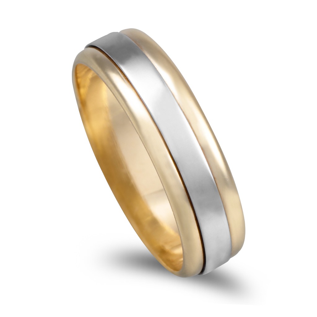 Aliança com base em ouro amarelo e centro em ouro branco. Pode ser usada para bodas de prata.