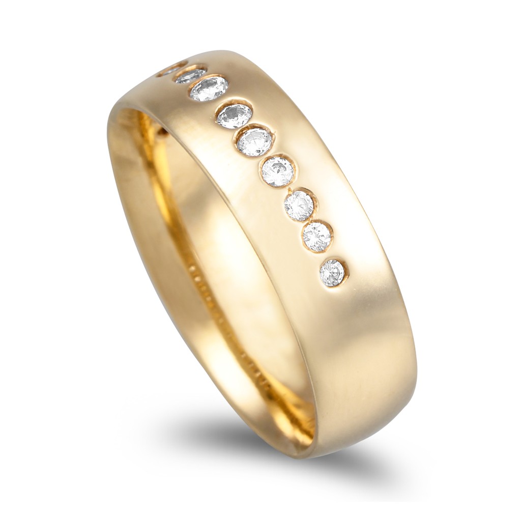 Aliança modelo amendoa leve em ouro franco de 19,2kl. A aliança tem acabamento polido e pedras.